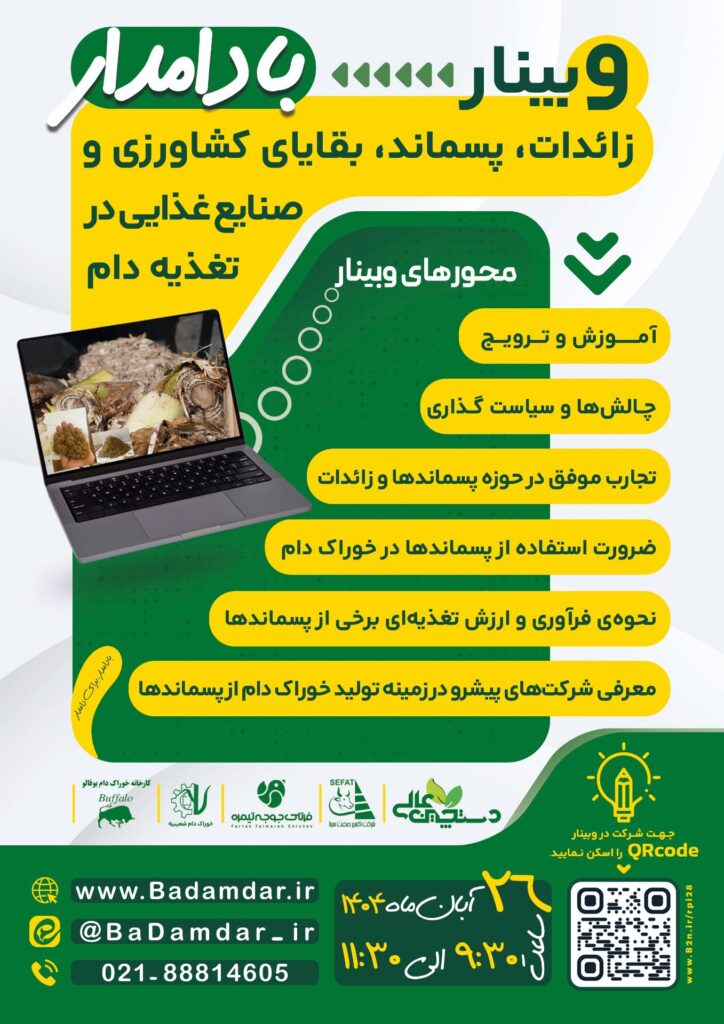 این وبینار با همکاری شرکتهای اکسیرصفت سینا، خوراک دام بوفالو، خوراک دام شعیبیه، دستچین عالی و فرتاک جوجه تیمره برگزار میشود.